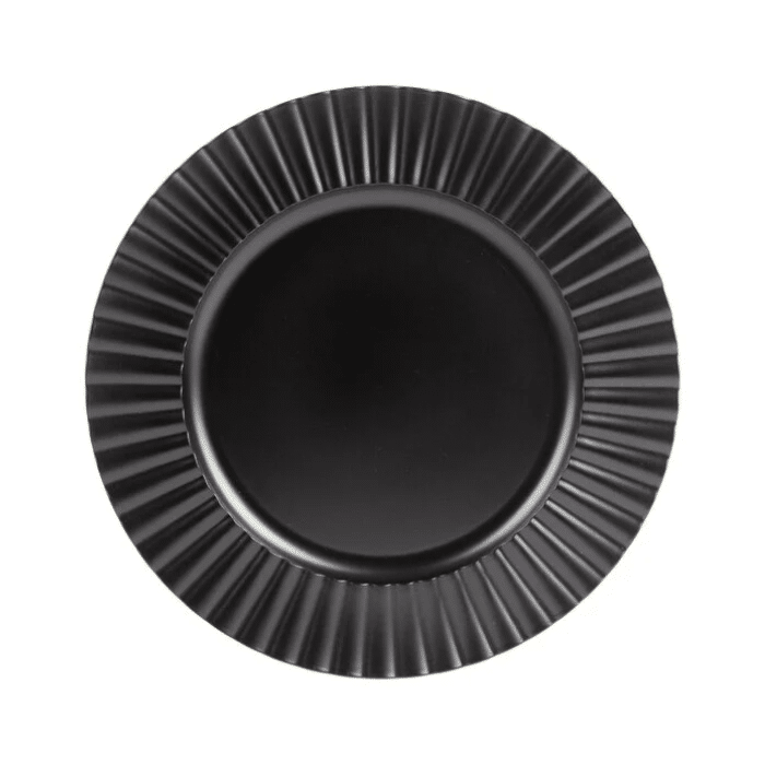 This Black Fluted Charger Plate features a bold, textured rim with a smooth center for a modern and elevated table setting. Its matte black finish adds depth and contrast, making it a striking base for dinnerware at weddings, galas, and upscale events. A versatile accent that pairs well with both minimalist and dramatic designs.
